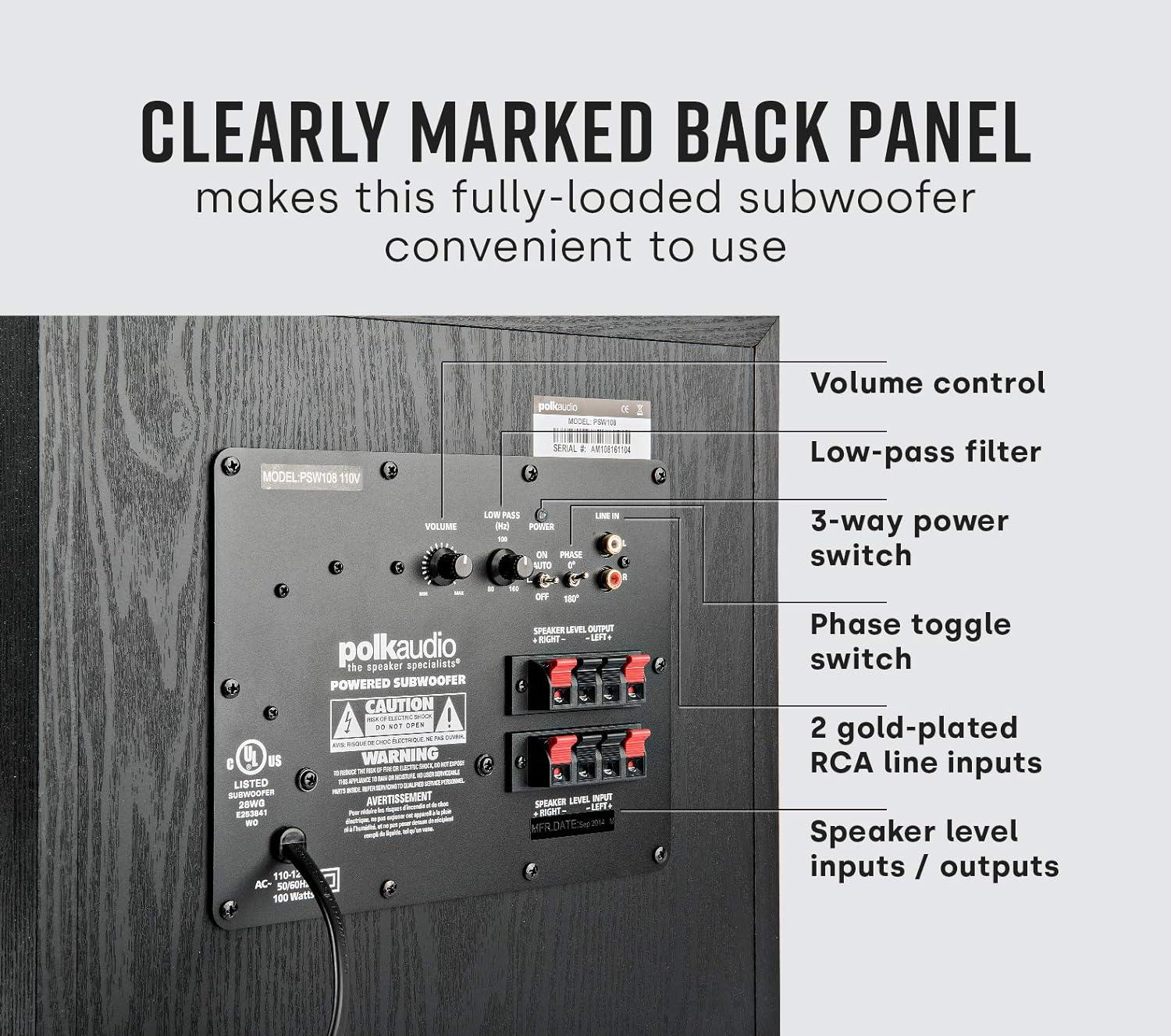 The PSW108 fills in the bottom end of your home theater system. Relieve your main speakers from performing bass duty and let them work on the mids and highs. The sub is a great addition to any subwooferless system and will bring your movie watching experience to the next level. Features a front-firing 10″ composite polymer cone driver that provides deep, accurate bass even at high volume levels. Polk’s superior engineering coupled with the use of resonance-free materials in the construction of the sub limit distortion and help deliver exceptional bass clarity. Line- and speaker-level inputs, and speaker level outputs allow easy connection to any system. The continuously variable low-pass crossover lets you dial in the sound to match the PSW108 to the rest of your speakers.